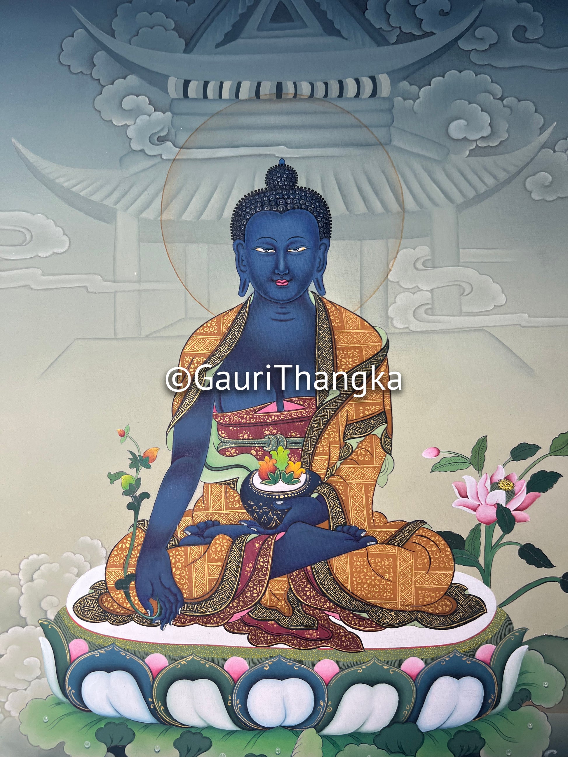 This piece is created using traditional mineral pigments, and includes subtle gold detailing to accentuate the radiant aura and symbols of healing. The deep lapis-blue tones reflect the Medicine Buddha’s association with purity, healing, and divine medicine.