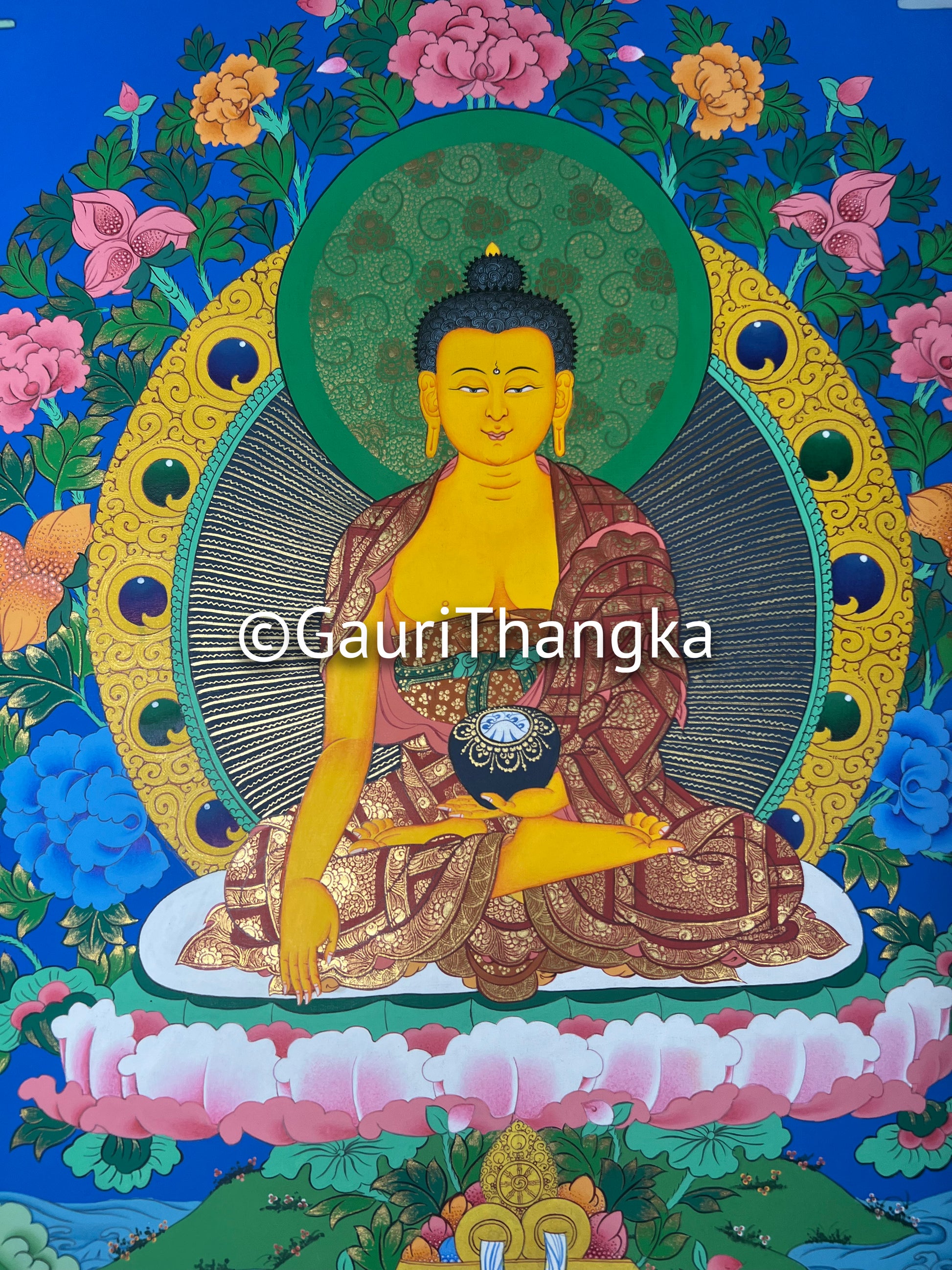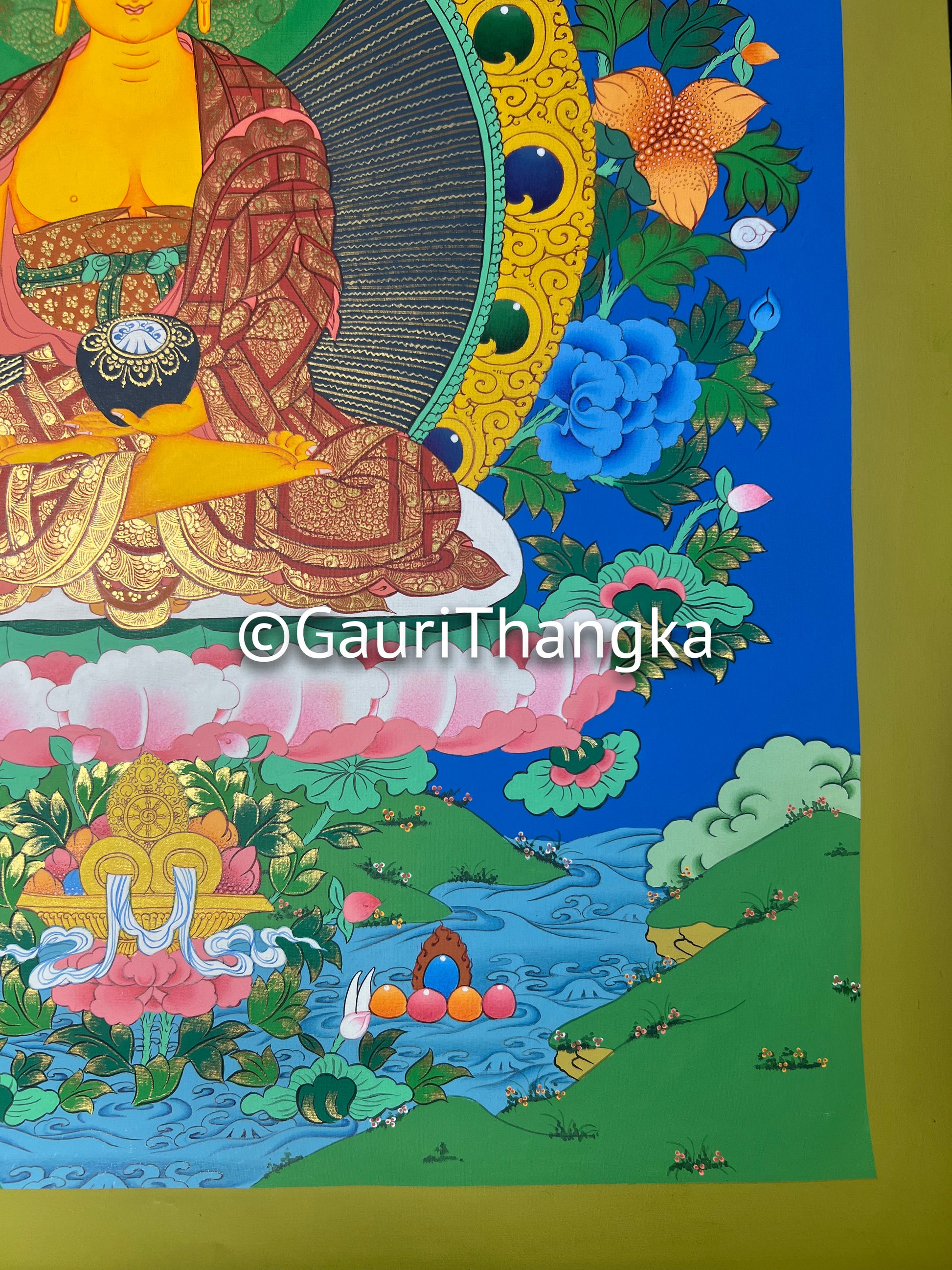 Our Thangkas are hand-painted on cotton canvas using natural mineral pigments and gold detailing.