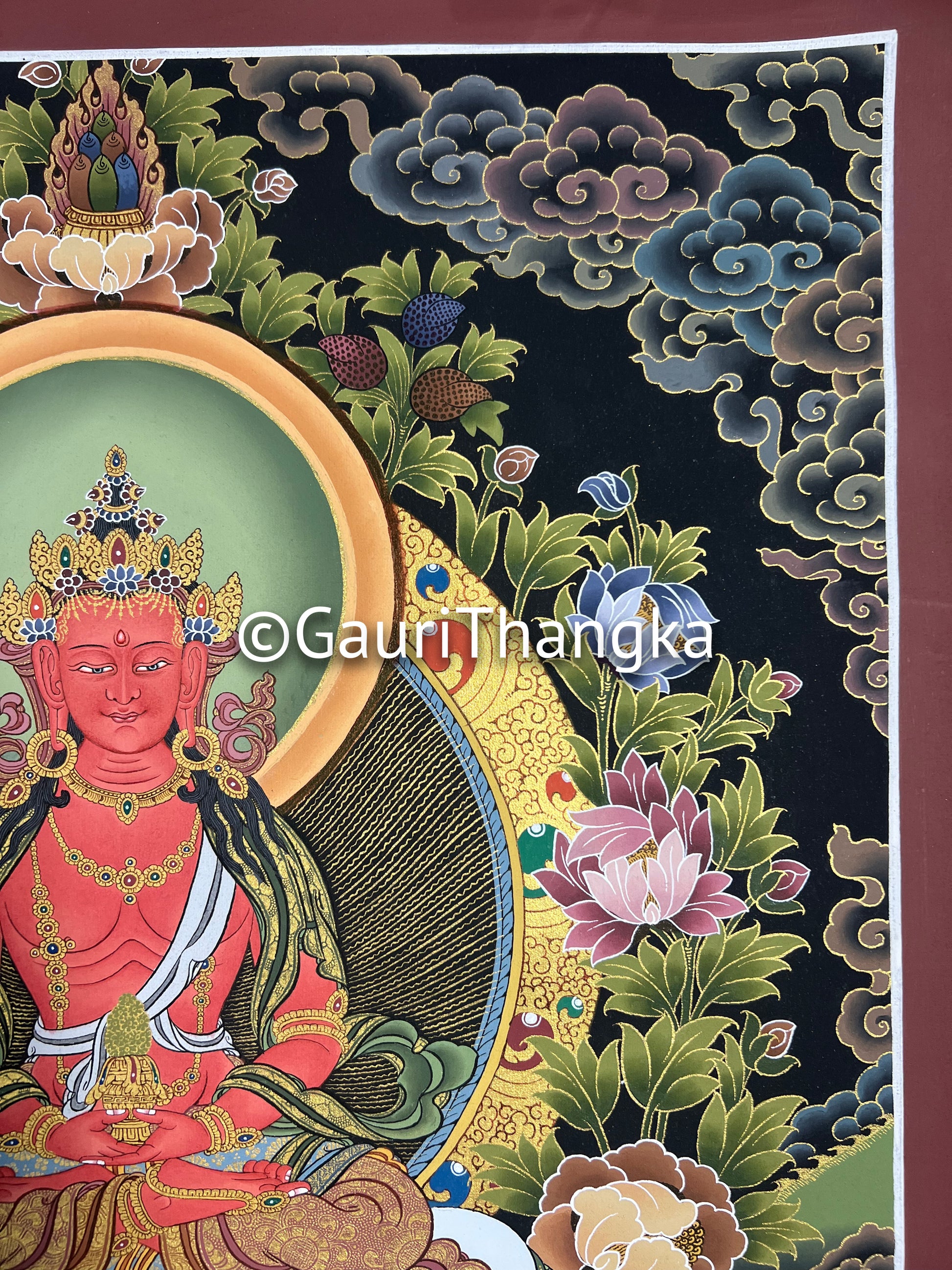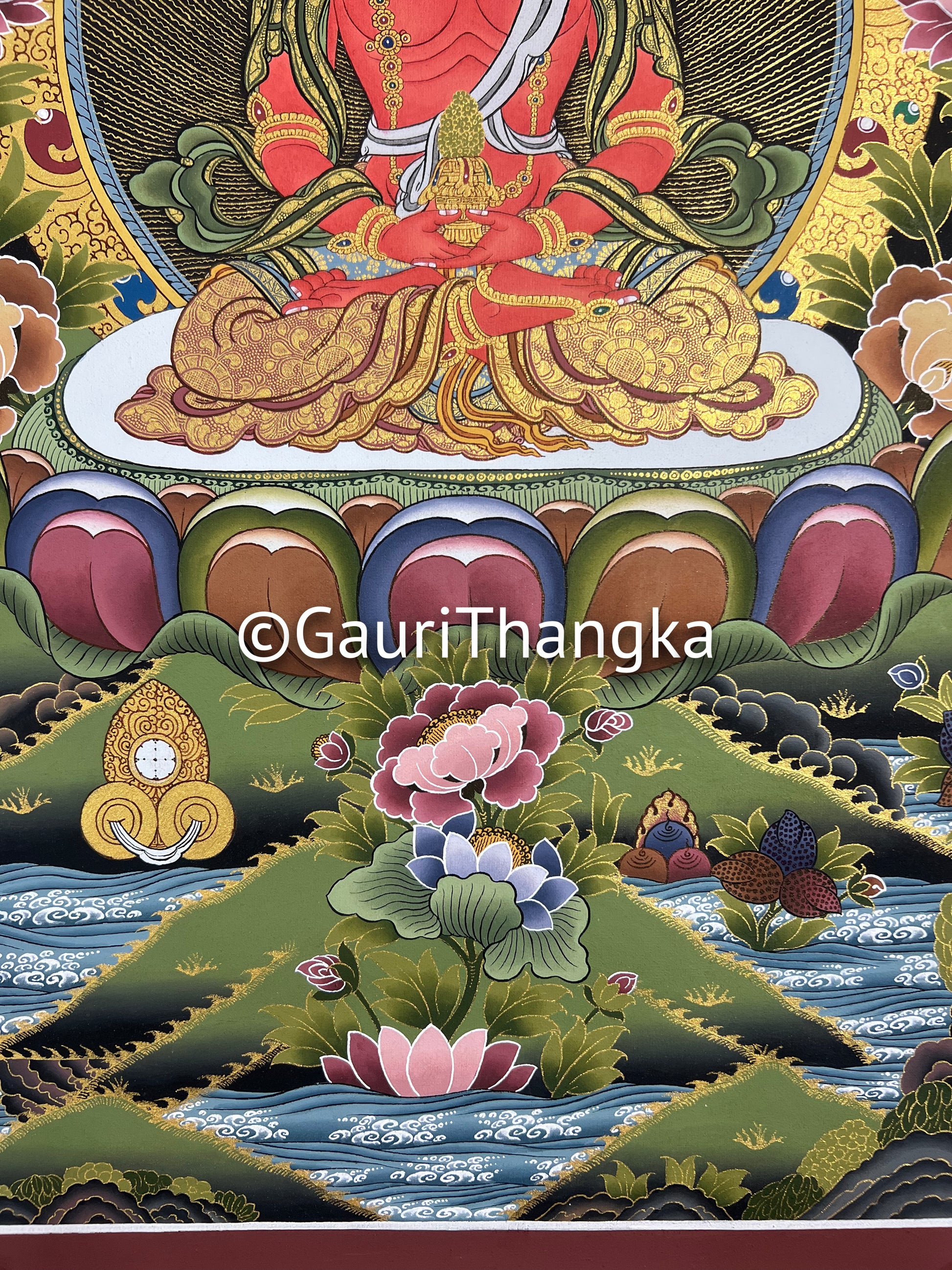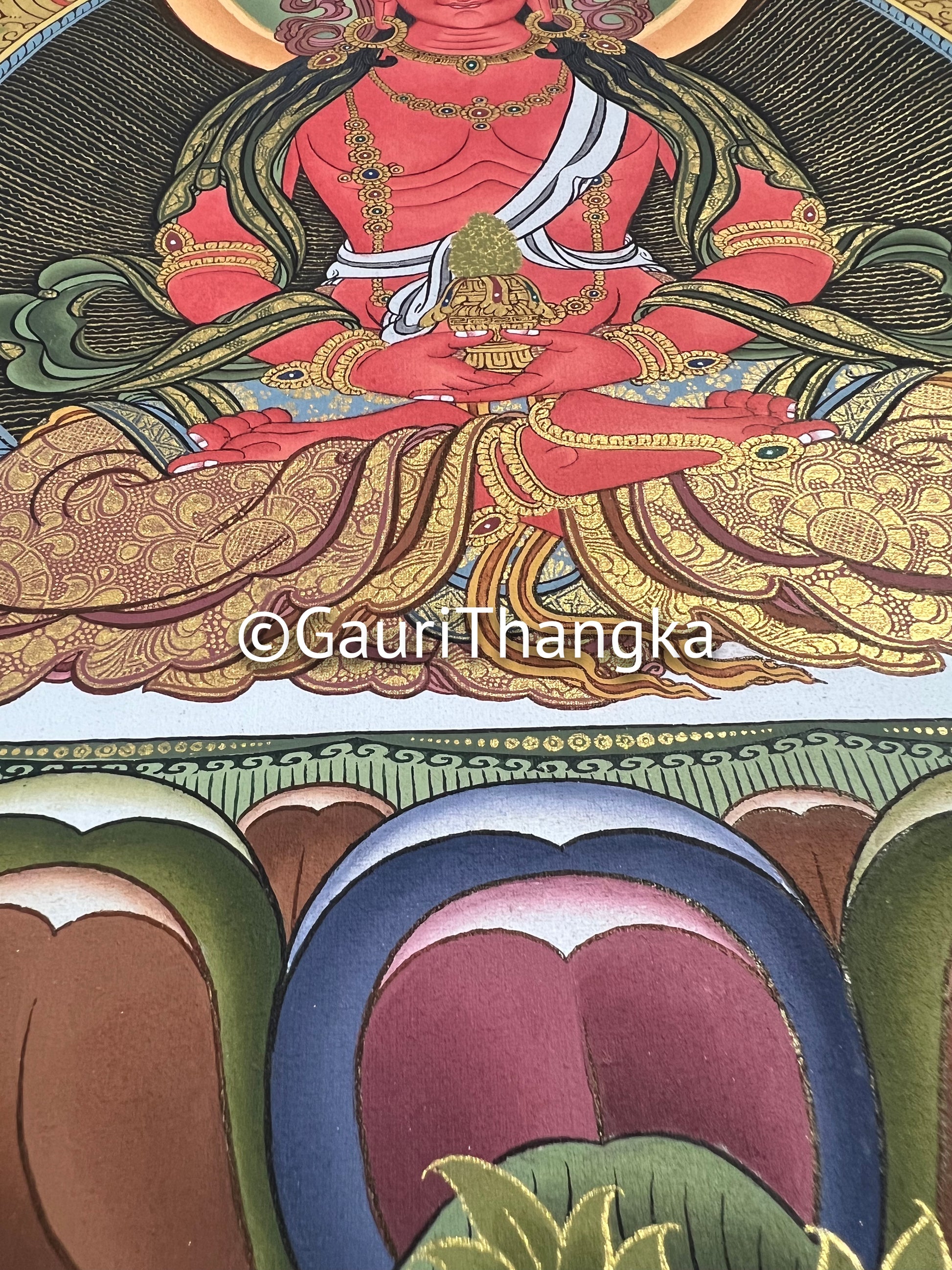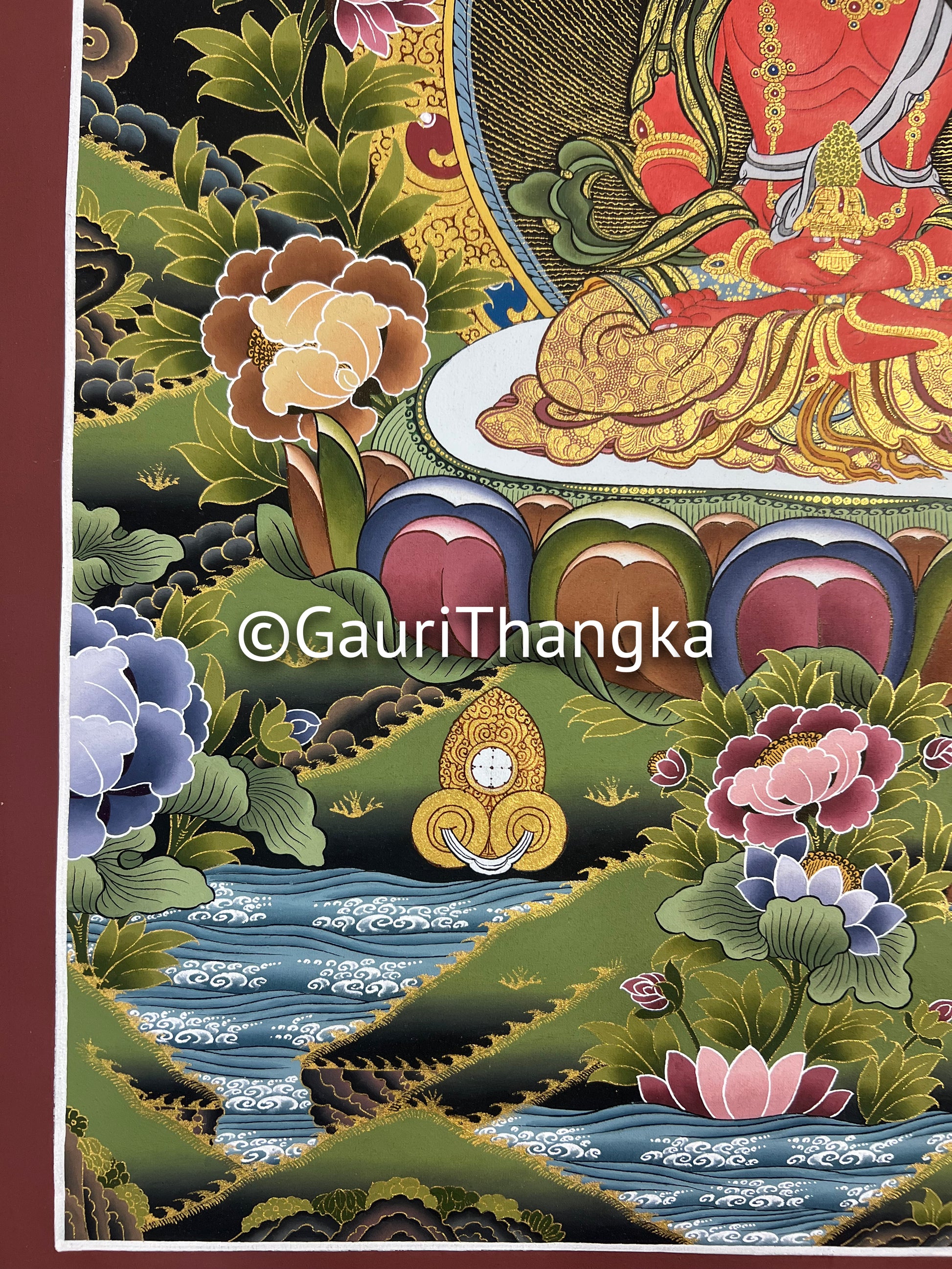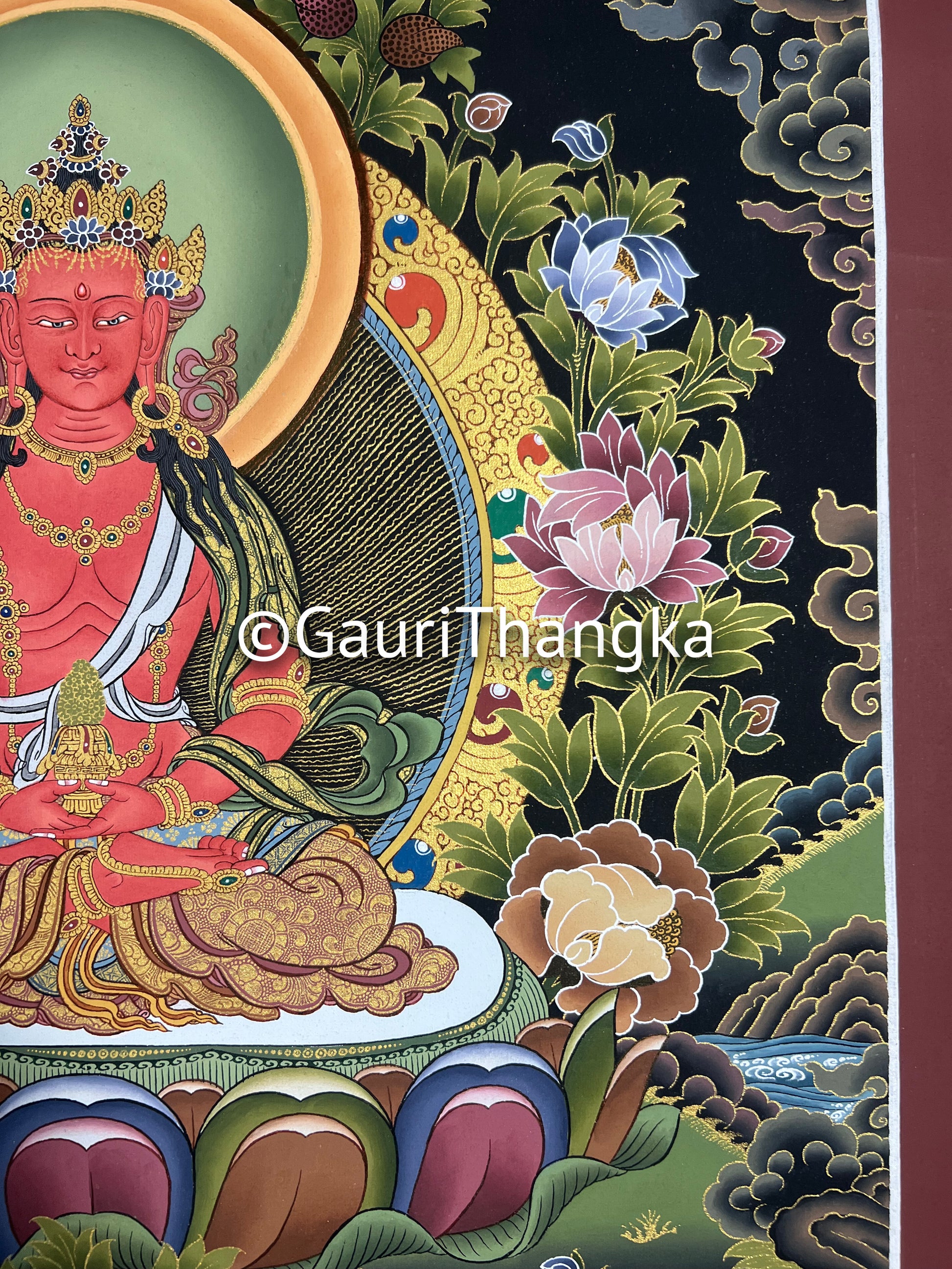 Embrace the brilliance of Rigdzin Jampelyang (Red Manjushri). The Bodhisattva of Wisdom in his radiant red form. This hand-painted Thangka  embodies eloquence, insight, and the power of enlightened knowledge. Painted with natural pigments and framed by a deep maroon border, it’s a striking addition for meditation spaces or sacred art collections.