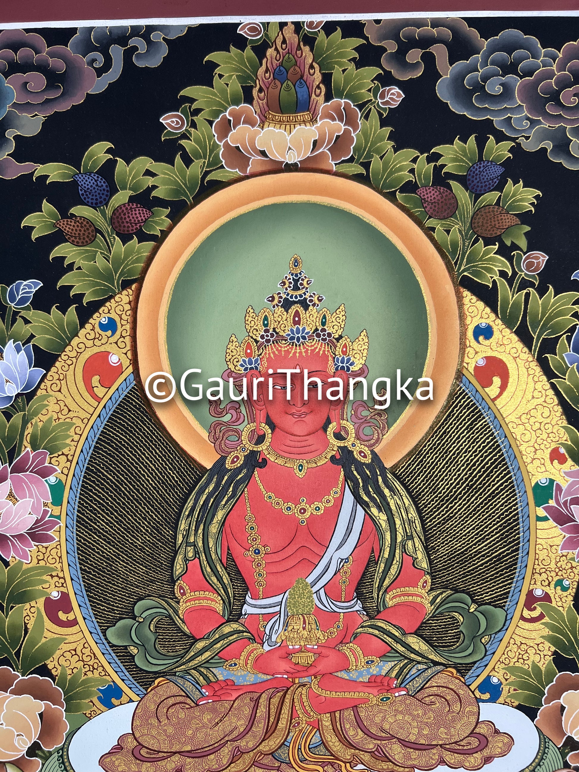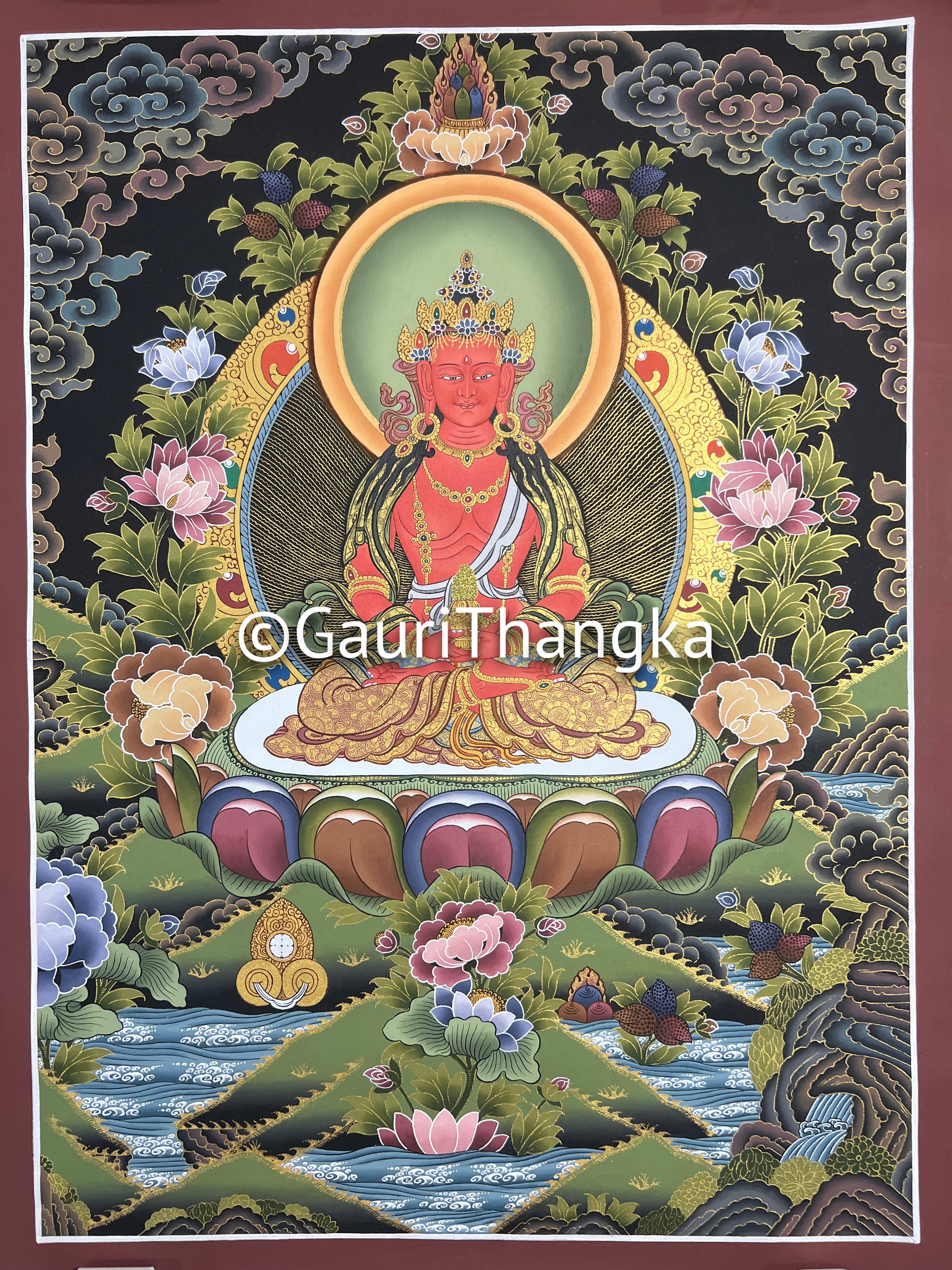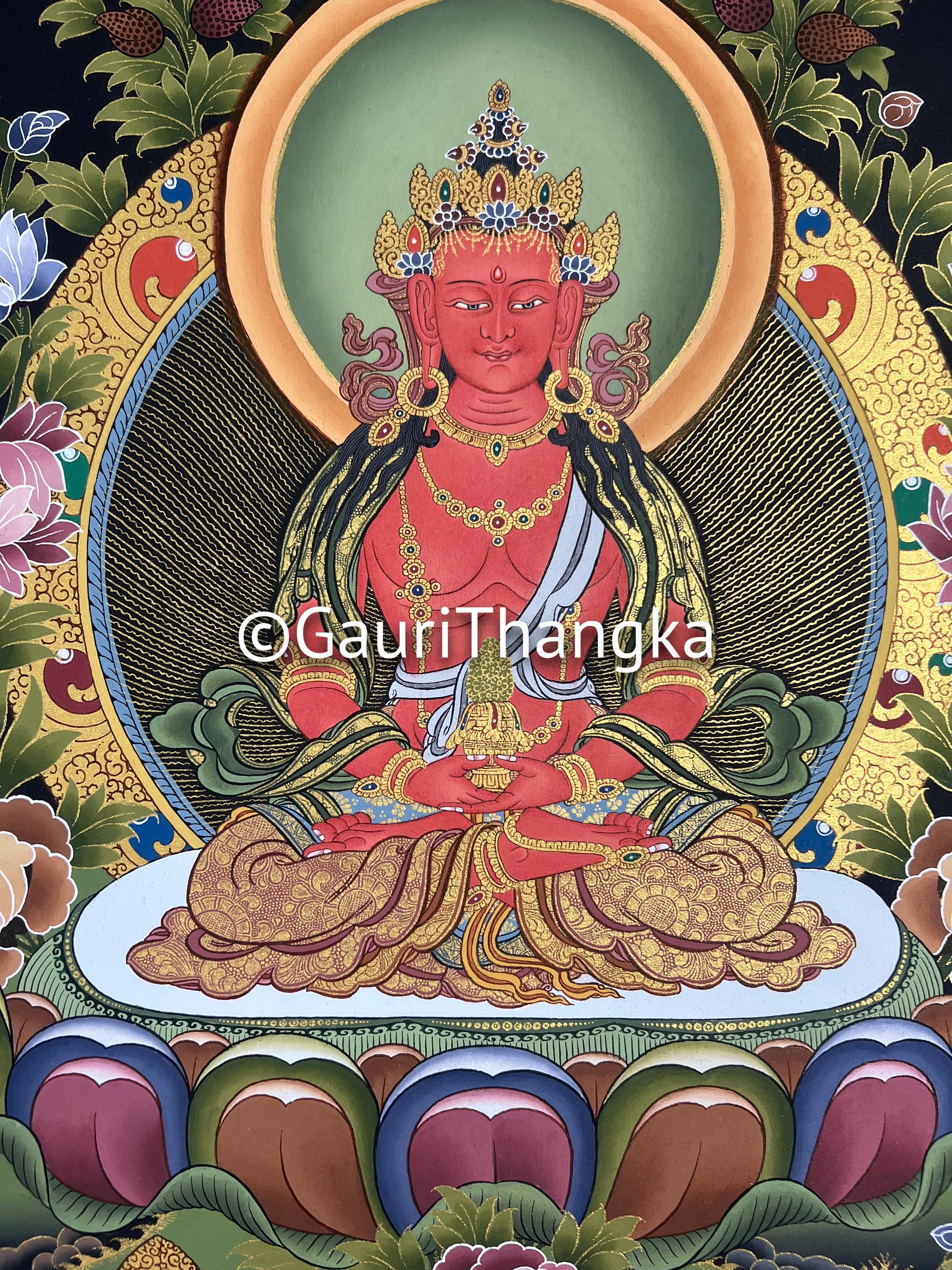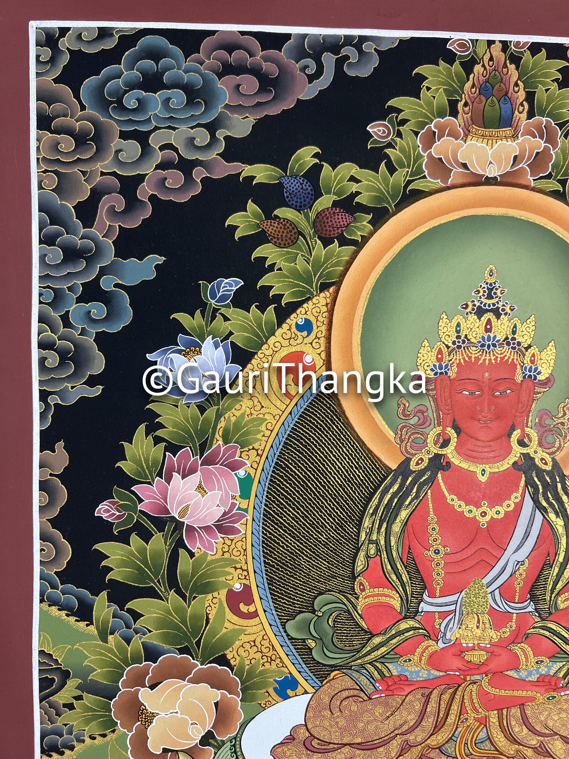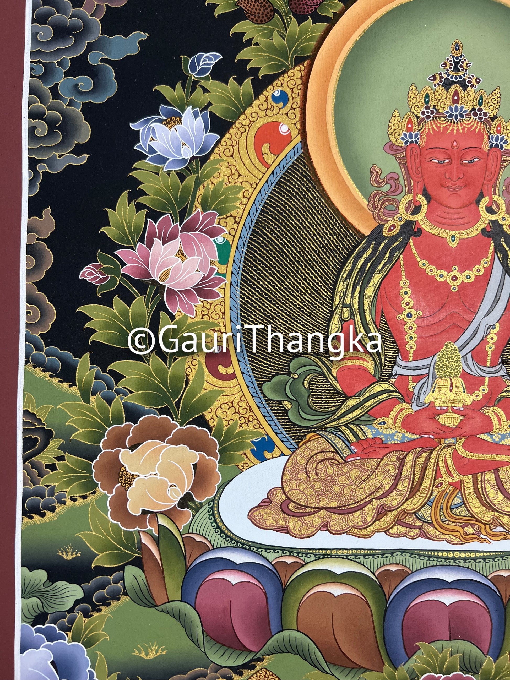 Embrace the brilliance of Rigdzin Jampelyang (Red Manjushri). The Bodhisattva of Wisdom in his radiant red form. This hand-painted Thangka  embodies eloquence, insight, and the power of enlightened knowledge. Painted with natural pigments and framed by a deep maroon border, it’s a striking addition for meditation spaces or sacred art collections.