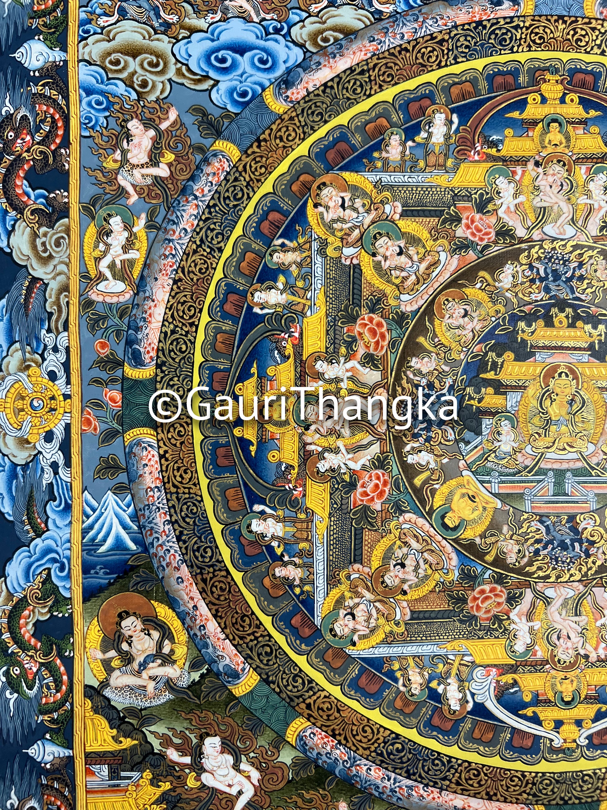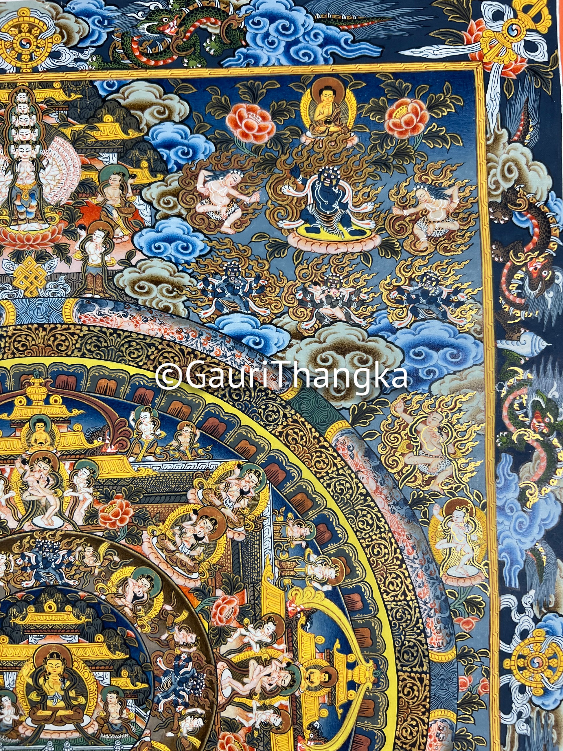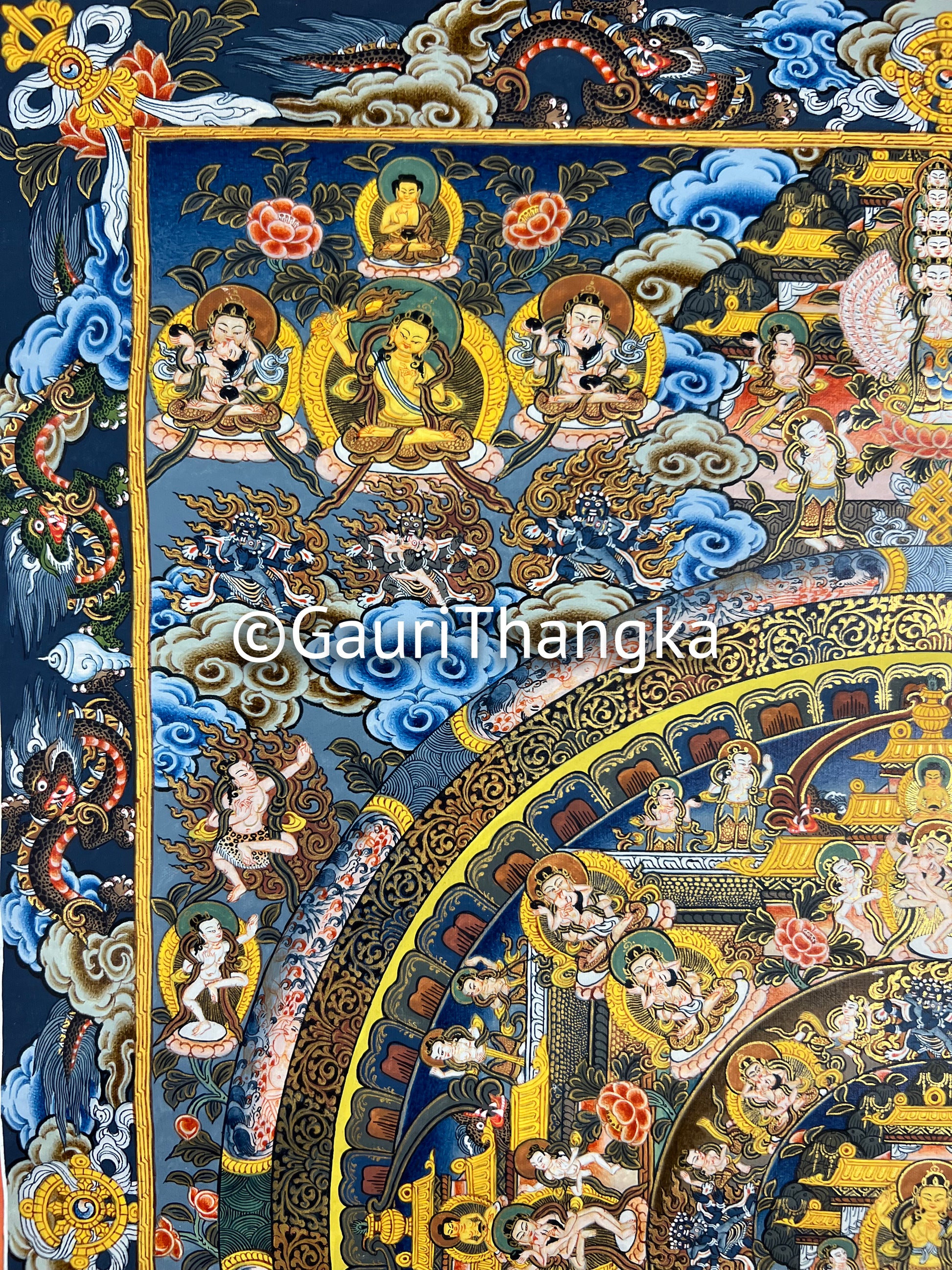 A sacred Universal Life (Kalachakra Mandala) Thangka that embodies time, balance, and the cosmic connection between all beings.